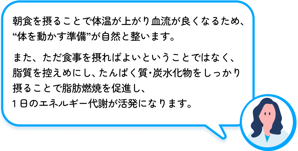 私たちの体は、睡眠中にエネルギーを消費し、朝には枯渇した状態です。ここで朝食を摂ることで、体の代謝がスムーズに始まり、体内時計がリセットされます。
