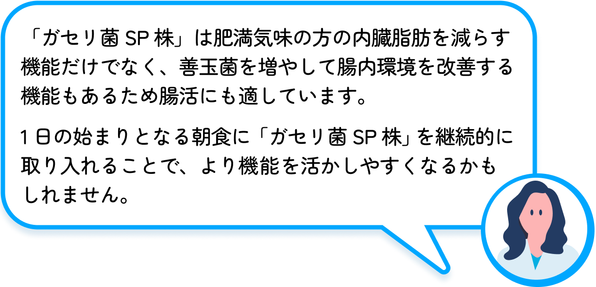 この「ガセリ菌SP株」には、肥満気味の方を対象とした臨床試験で、食事と一緒に摂取することで内臓脂肪を減らす機能が報告されています。これは、「ガセリ菌 SP 株」が腸内で特定の働きをすることで、余分な脂肪の吸収を抑え、体外への排出を促すためと考えられています。