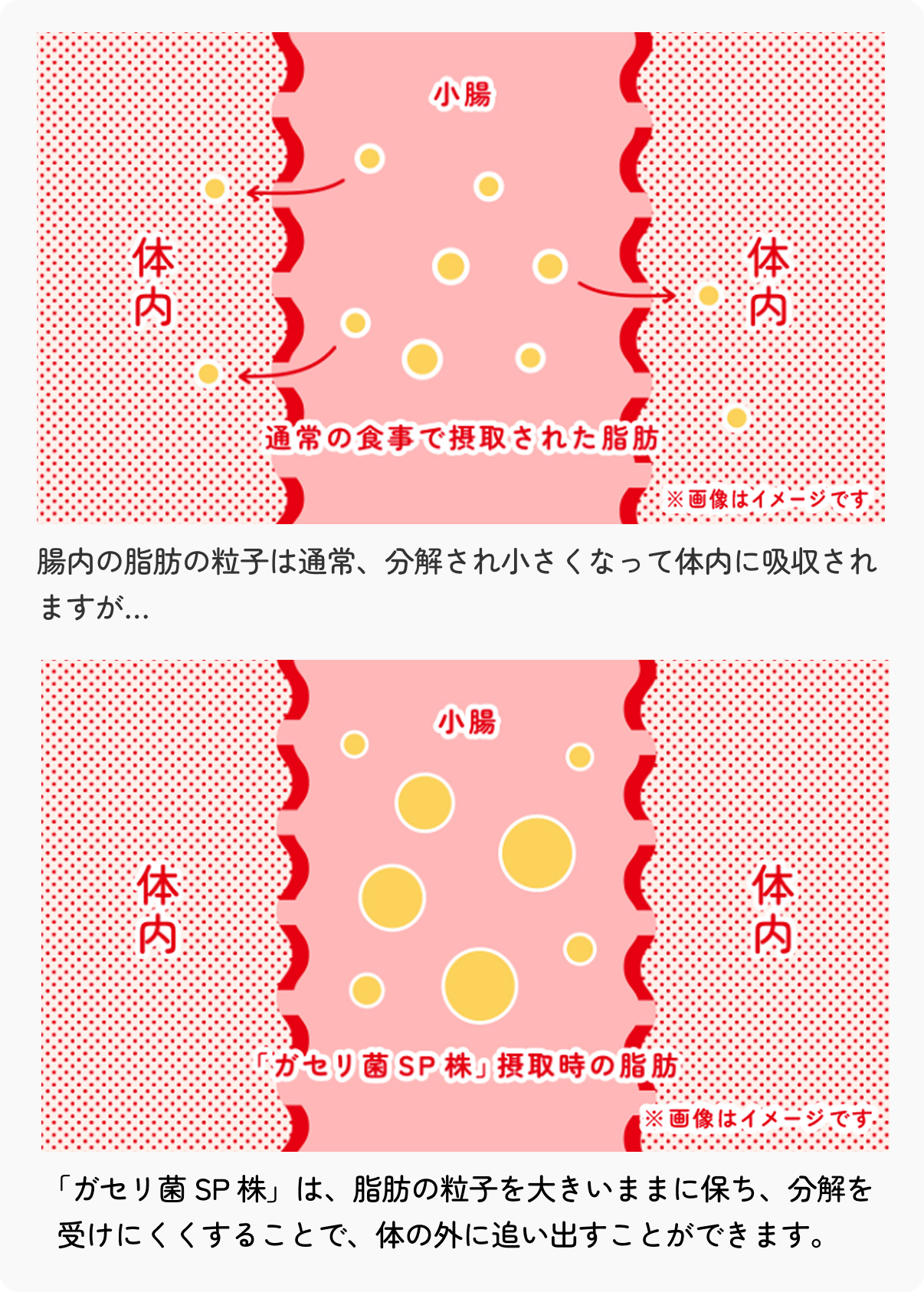 そこで今、注目されているのが、脂肪の吸収を抑えるメカニズムをもつ「ガセリ菌SP株」。