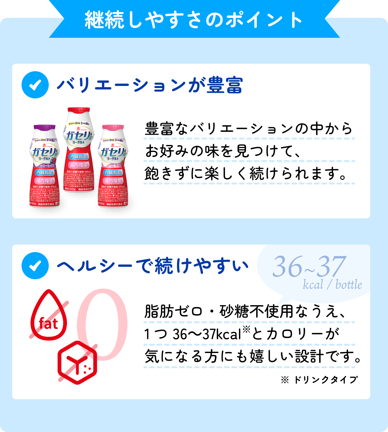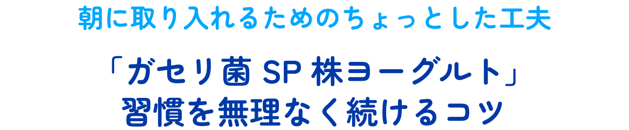 毎日の食事、特に朝食と組み合わせて「ガセリ菌SP株」を摂取することで、日々、そして効果的に"続けられる形"にすることができます。